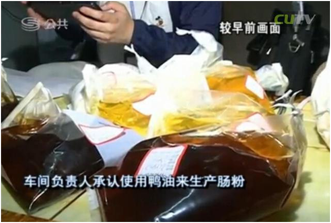 在執(zhí)法人員查獲6桶來歷不明的油之后,車間負責人承認使用鴨油來生產(chǎn)腸粉?!斑@是什么油?”“是鴨油?!薄翱绝喪O碌哪欠N?”“對?!?