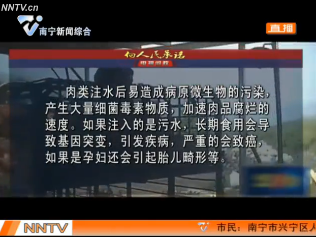 南寧市食品藥品監(jiān)督管理局局長黃明瑞回應(yīng):對(duì)于注水肉的問題,我們從改革以來就一直堅(jiān)持打擊,特別是今年夏季針對(duì)肉類食品進(jìn)行了大規(guī)模的整治行動(dòng),發(fā)現(xiàn)問題后馬上進(jìn)行懲處。首先我們要從源頭上杜絕注水肉,第二,肉類在進(jìn)入市場(chǎng)要進(jìn)行檢驗(yàn)檢測(cè),合格以后才能上市銷售,市場(chǎng)開放方要建立查驗(yàn)查證制度,作為監(jiān)管部門要加大巡查力度,發(fā)現(xiàn)有違法添加的要立案進(jìn)行查處。