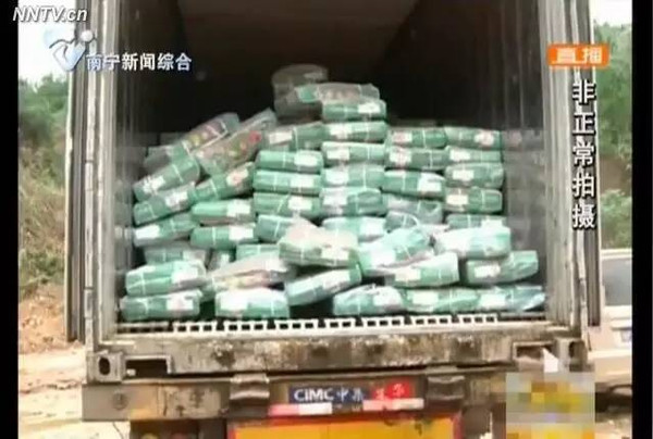 5月7日上午11點(diǎn)30分,劉圩鎮(zhèn)覃坡一處廢棄的木片廠區(qū)內(nèi),兩輛玉林牌照的紅色集裝箱貨車停放在空地,幾個(gè)貨車司機(jī)邊觀望邊等待。兩小時(shí)后,一輛藍(lán)色大貨車開進(jìn)廢棄廠區(qū),并與其中一輛集裝箱貨車尾對(duì)尾交接。