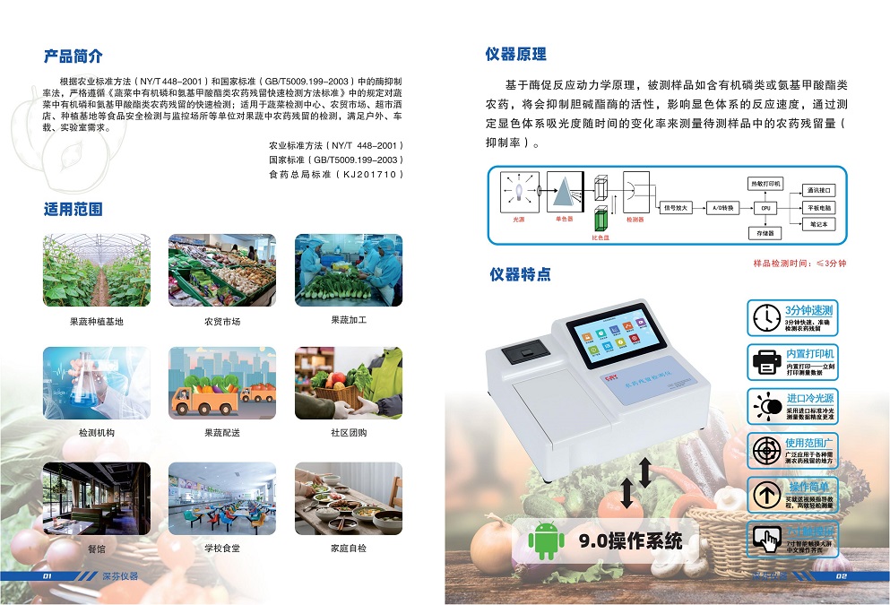 深芬儀器生產(chǎn)的安卓智能型農(nóng)藥殘留測定儀;是根據(jù)農(nóng)業(yè)標準方法(NY/T 448-2001)和國家標準(GB/T5009.199-2003)中的酶抑制率法,嚴格遵循《GB/T5009.199-2003蔬菜中有機磷和氨基甲酸酯類農(nóng)藥殘留快速檢測方法標準》中的規(guī)定對蔬菜中有機磷和氨基甲酸酯類農(nóng)藥殘留的快速檢測??蓮V泛應(yīng)用于各級蔬菜檢測中心、農(nóng)貿(mào)市場、超市、環(huán)保機構(gòu)、蔬菜種植基地、飯店、車載及實驗室等食品安全檢測與監(jiān)控場所等單位對果蔬中農(nóng)藥殘留的檢測。農(nóng)藥殘留測定儀能準確、快速檢測出蔬菜、水果、糧食、茶葉以及土壤中有機磷和氨基甲酸脂類農(nóng)藥殘留的快速檢測。