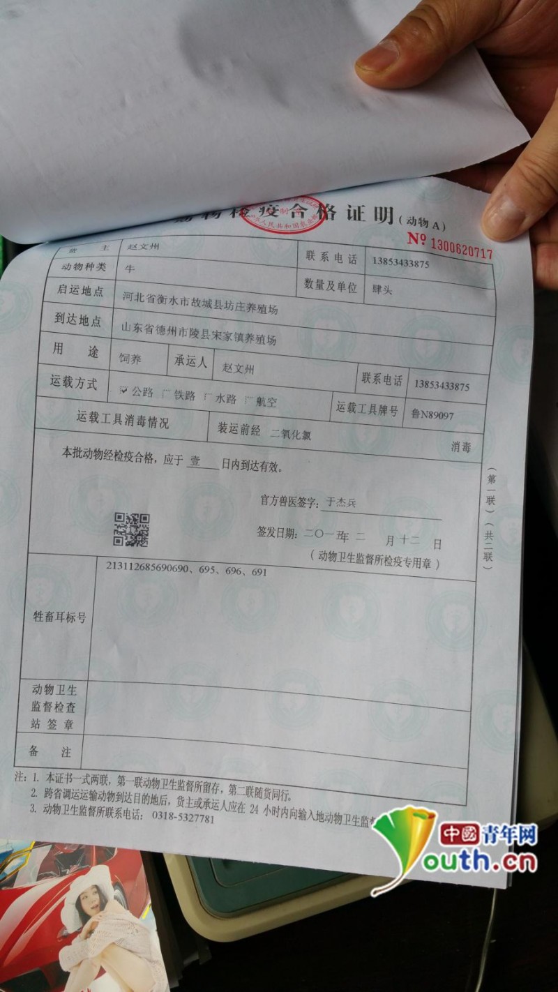 此后中國青年網(wǎng)記者致電編號為1300620717檢疫證明存根聯(lián)上的趙姓“承運人”進一步核實,對方告訴中國青年網(wǎng)記者,他以前確實到故城運過牛,但“都是半年前的事了”,并不是檢疫證明上寫的2月12號,而且數(shù)量也不對。檢疫證明是“通過中間人開的”,他并沒有見到,并且運的是6頭“奶牛”,并不是屠宰用的肉牛。